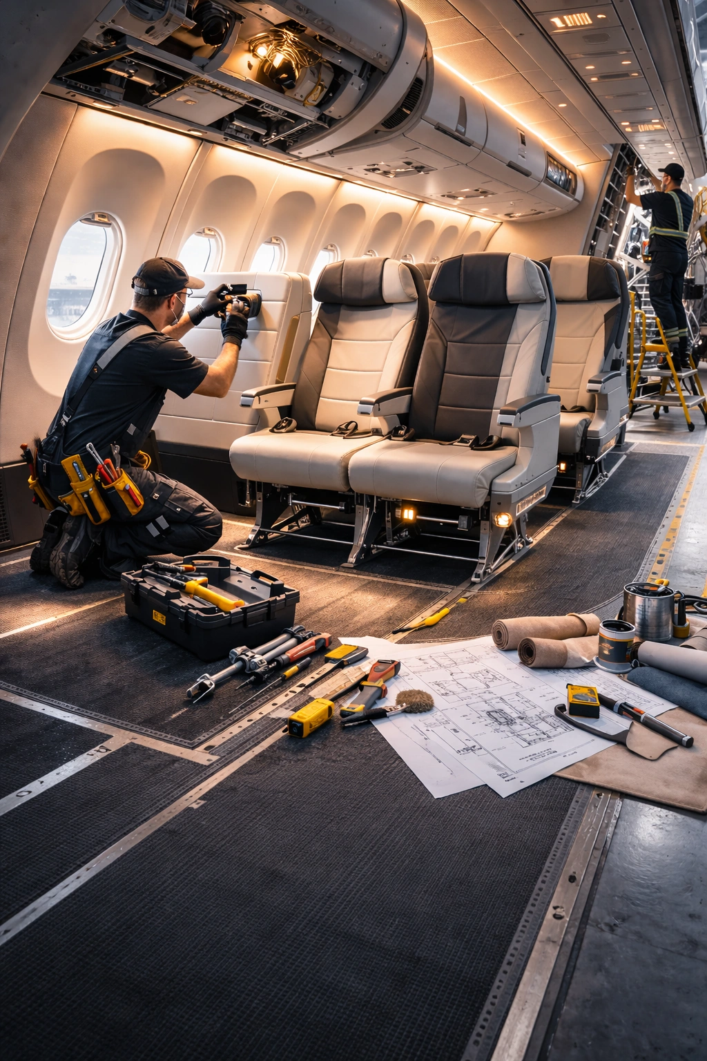 "Intervención estética y funcional de cabinas con materiales de grado aeronáutico que cumplen con los más estrictos estándares de inflamabilidad y ergonomía."